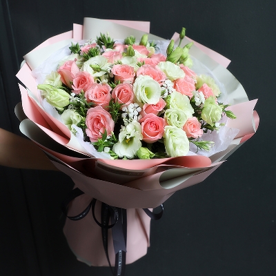 【材 料】:精选19枝戴安娜玫瑰。6枝绿色桔梗间插。白色相思梅丰满。